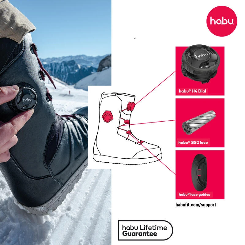 Fournis par BOA Technology Inc, les molettes et les lacets du système d’ajustement habu® ont subi des milliers d’heures de tests rigoureux en laboratoire et sur le terrain, et sont garantis pour la durée de vie de la botte sur laquelle ils sont intégrés.