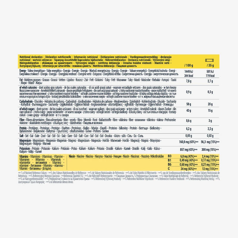 Ingrédients : Pâte de dattes 67%, flocons d’avoine (gluten), graines de tournesol 7%, flocons de banane 4%, graines de lin 3%, huile de tournesol, minéraux (magnésium, potassium), vitamines (acide L-ascorbique (C), mononitrate de thiamine (B1), nicotinamide (niacine, B3) et chlorhydrate de pyridoxine (B6)), arôme naturel de banane.